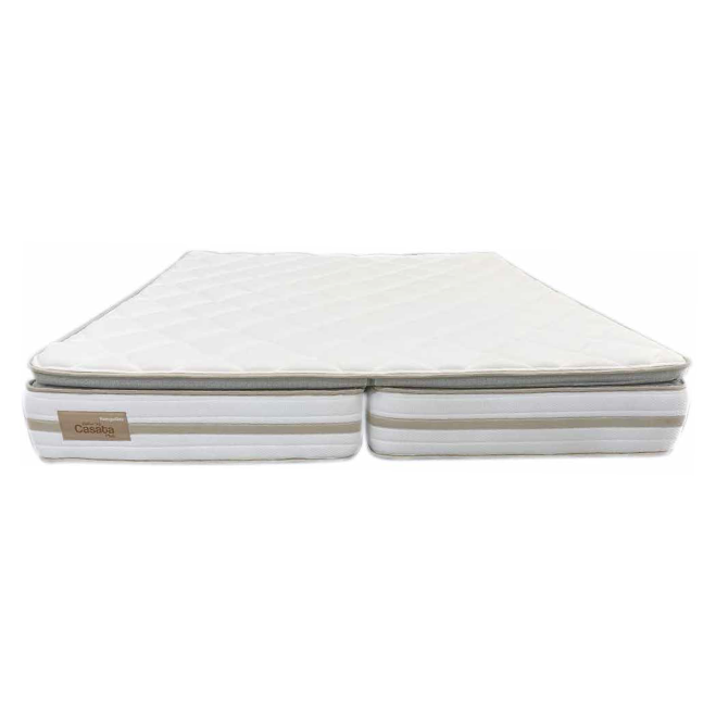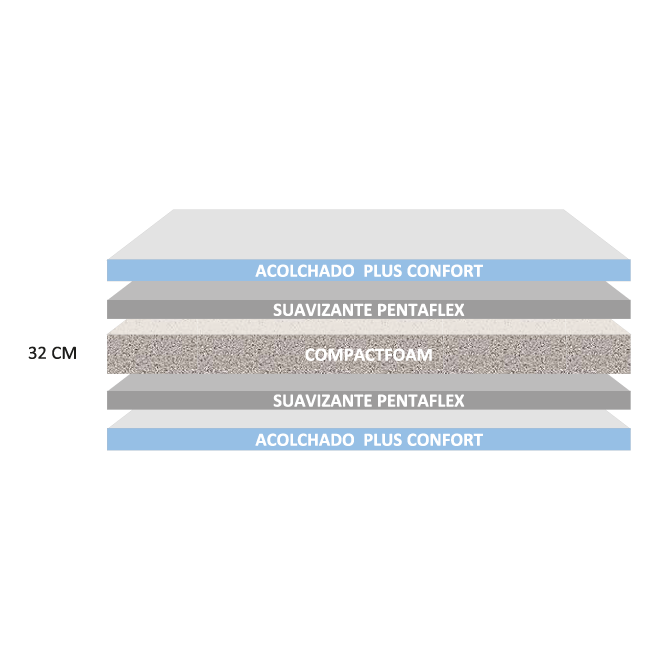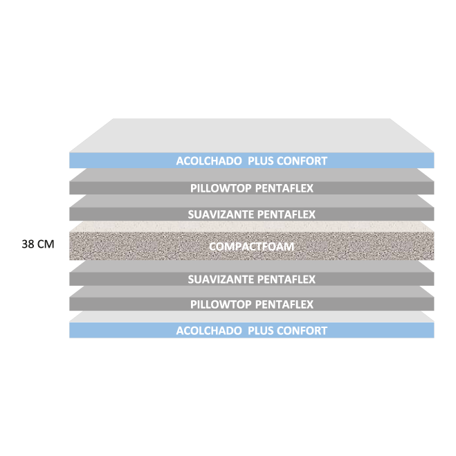 Colchón fabricado con núcleo interno de compact foam(CASATA), esta superficie ortopédica es reco- mendada por especialistas para prevenir y corregir problemas de columna, suavizante en espuma Penta y pillowtop acolchado plus confort que libera puntos de presión en hombros y cadera, tela tejido de punto de alto gramaje para mayor frescura soporte de carga hasta 120 kg p/p altura incluido acolchado 32 cm y 38 cm garantía 4 años por estructura interna.