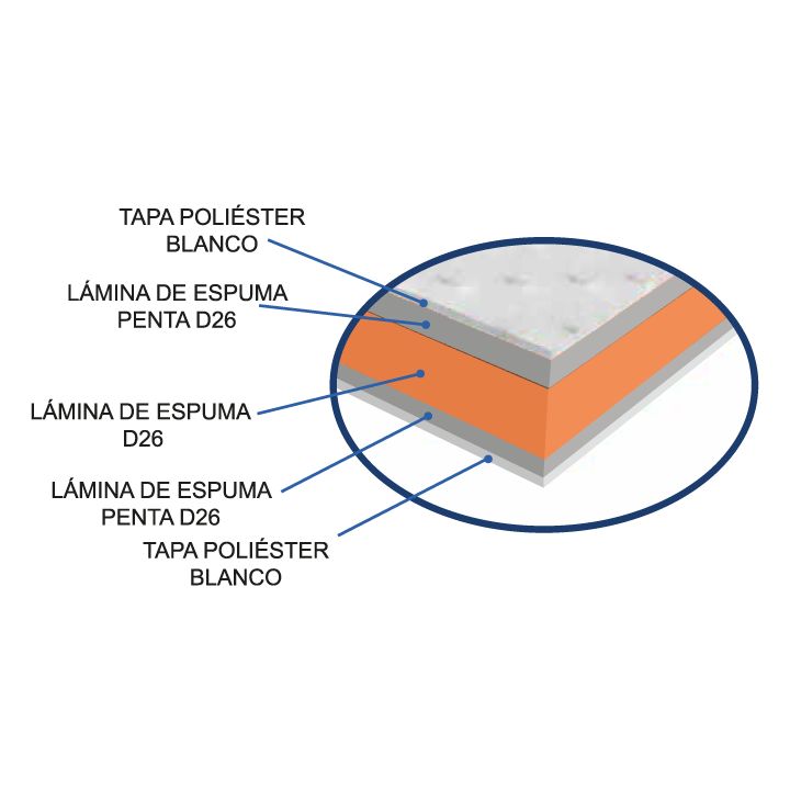 Espuma Flexible de Poliuretano poliflex, con un núcleo compuesto por una láminaD26 y dos láminasD26 Penta gris. Amplio y novedoso sistema de acolchado clásico en espuma de alta densidad que genera un alto confort a la hora de dormir.